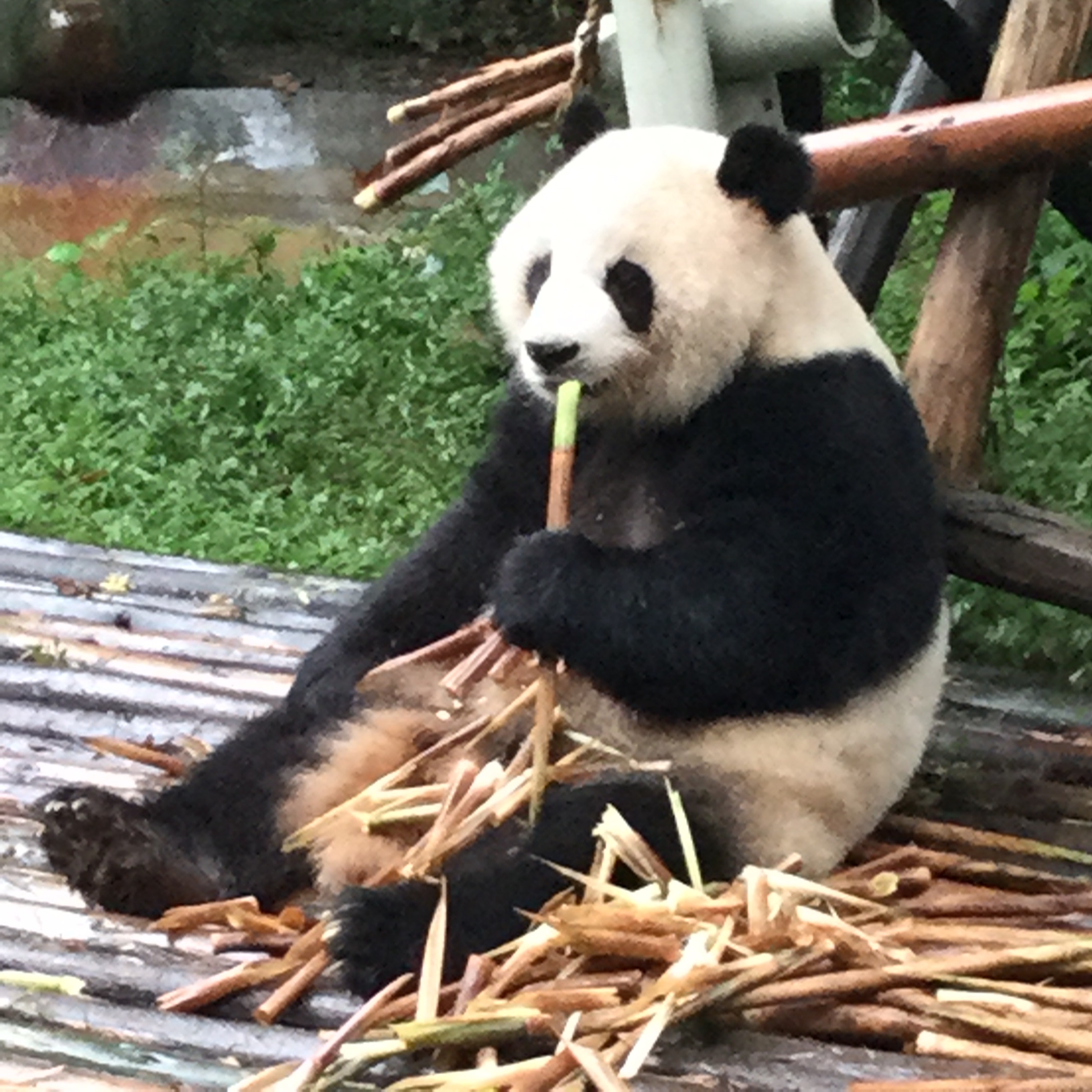 seeing the Pandas in fluffy, cuddly reality. We had no sooner arrived and entered the Base when we saw our first adult Panda who was in an open enclosure feeding on Bamboo. Today was a good day to visit the Pandas as it was raining and they prefer this type of weather. It was a privilege to actually see a Panda in real life and it was a truly wonderful experience. The talk in the group was about how lovely they were and there was a nice buzz within the
