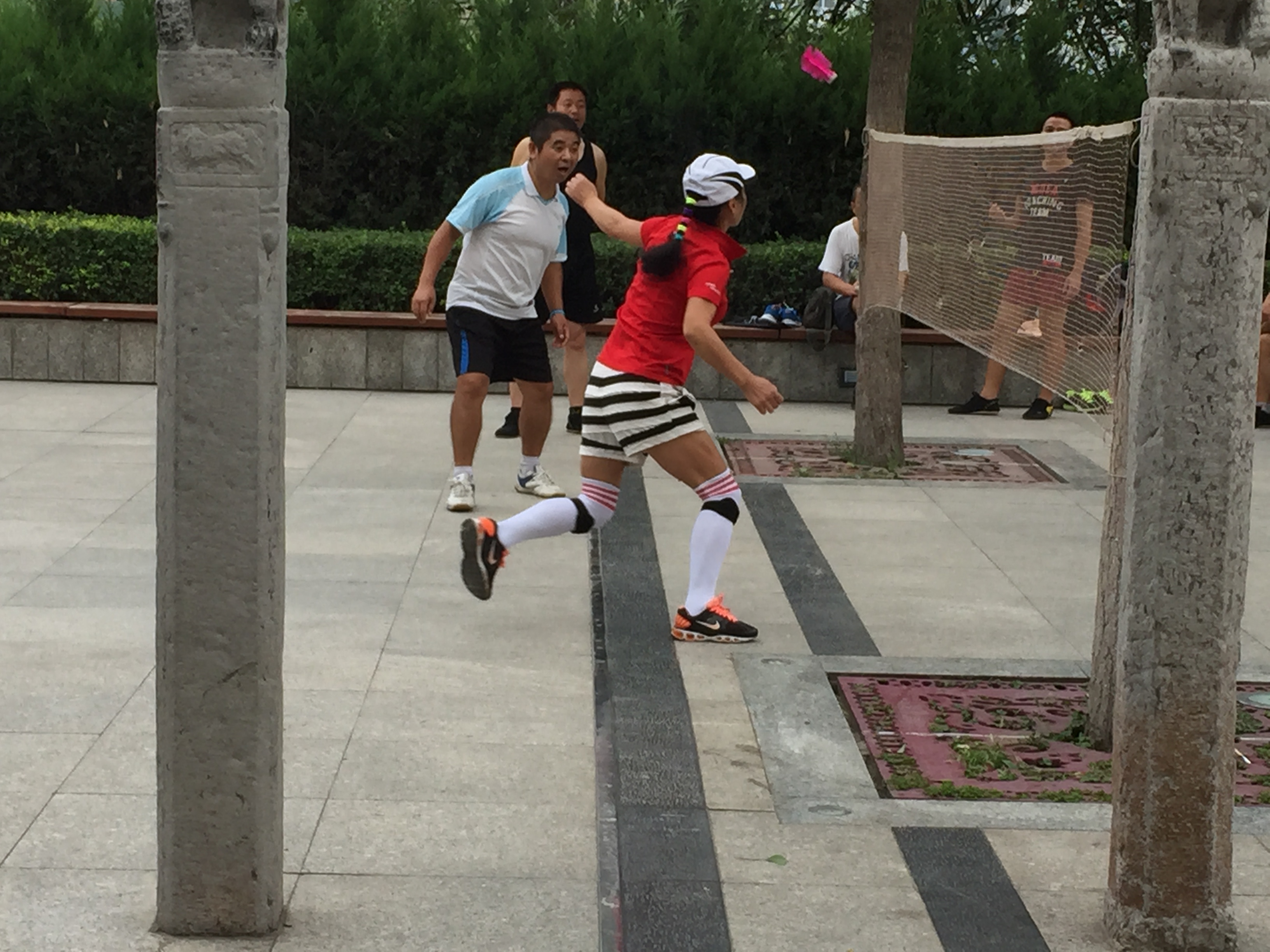 Foot Badminton in the parkTo get to the nearest access point we walked through the parks which are situated around the outer edge of the walls. In these parks many types of physical activity are underway, such as Tai Chi, Ballroom Dancing, Foot Badminton and Physical Exercises. When we stopped to watch the Foot Badminton a number of people came over to us and started kicking the shuttlecock (this is larger and more