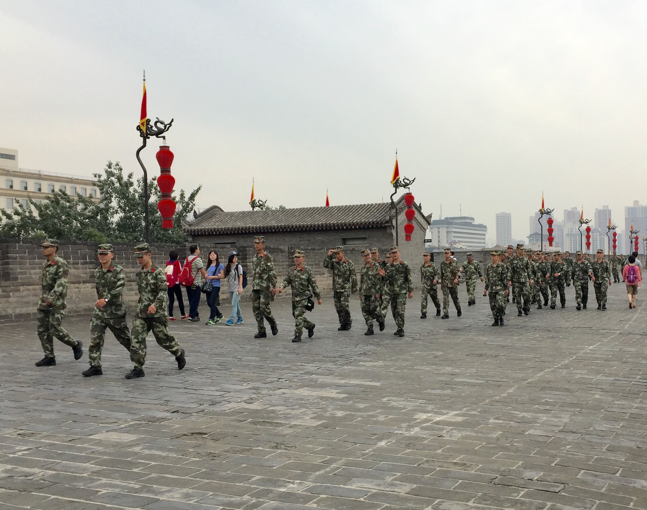 Again we were attracting attention and the most interesting aspect of this attention was a Chinese army battalion who were walking the walls and wanted to have their photographs taken with us. These soldiers appeared to be recruits and were also visitors to Xian. They were smiling, saying hello, the only word they seemed to know and shyly indicating that they would like to have a photograph with us. We duly obliged. We walked two sides of the walls and decided to get off in order to walk through the Muslim quarter once again.