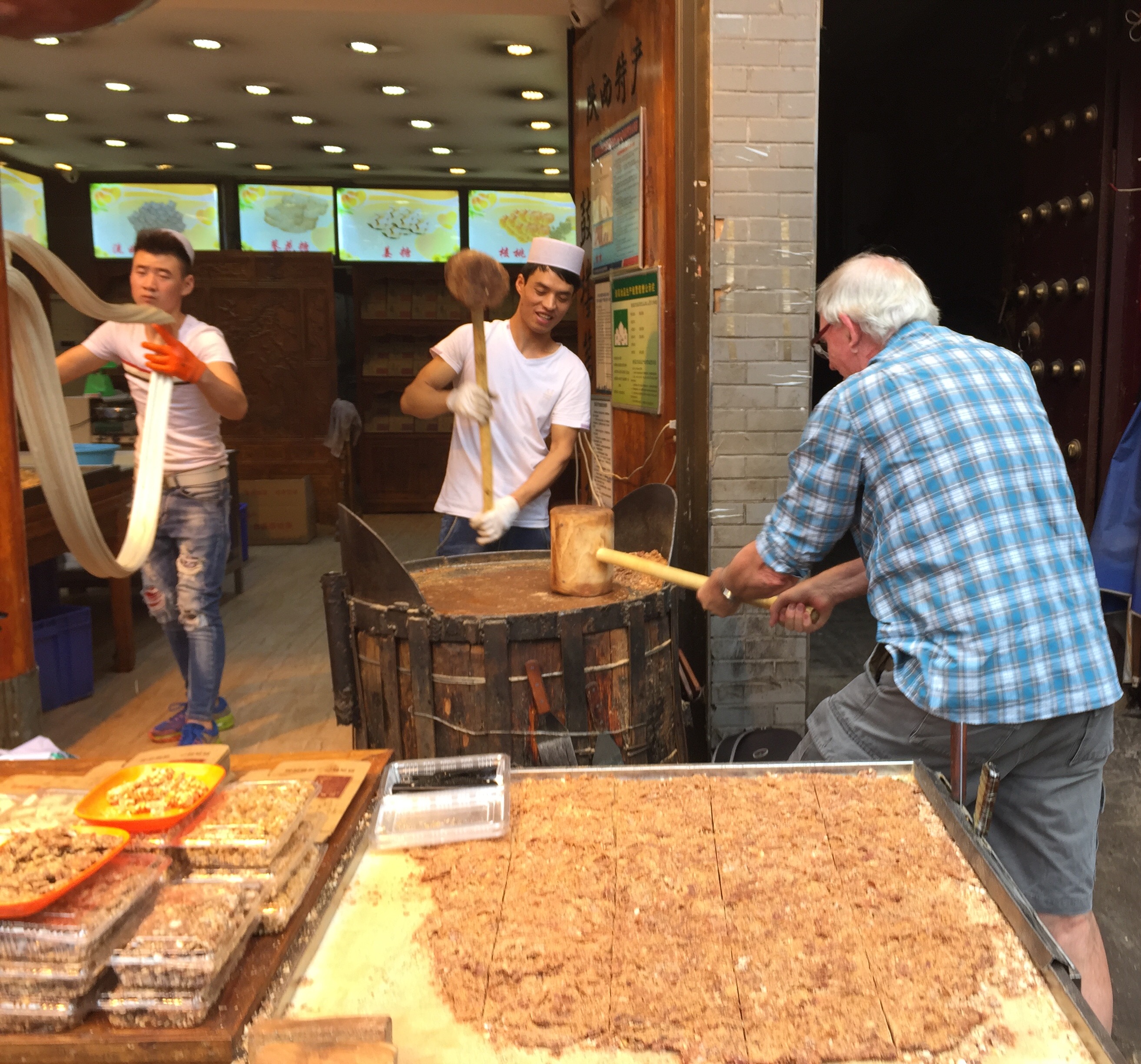 Chinese soldiers sightseeing on Xian wallAs experienced the previous afternoon the quarter was a hive of activity, a riot of colour and even more crowded. What was noticeable today in terms of food was the different types of breads, mainly flatbreads, the meats being cooked on the side of the street, peanut candy being pounded with mallets. You can also see the candy man stretching the mixture from a hook in a post on the side of the street and extending it to about 8 feet in length. Ed was invited to swing the mallet which you do with a second person and therefore have to fit in with the rhythm of alternating swings.